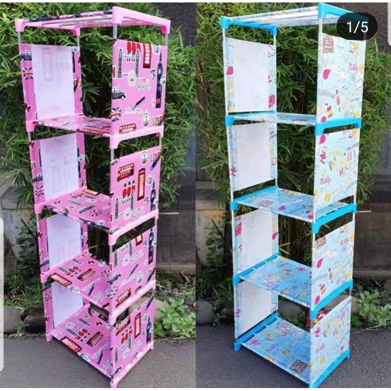 Rak buku portable yg terbuat dr bahan rangka pipa besi dan kain non wafon fabrik yg berguna utk menyimpan buku agar tertata