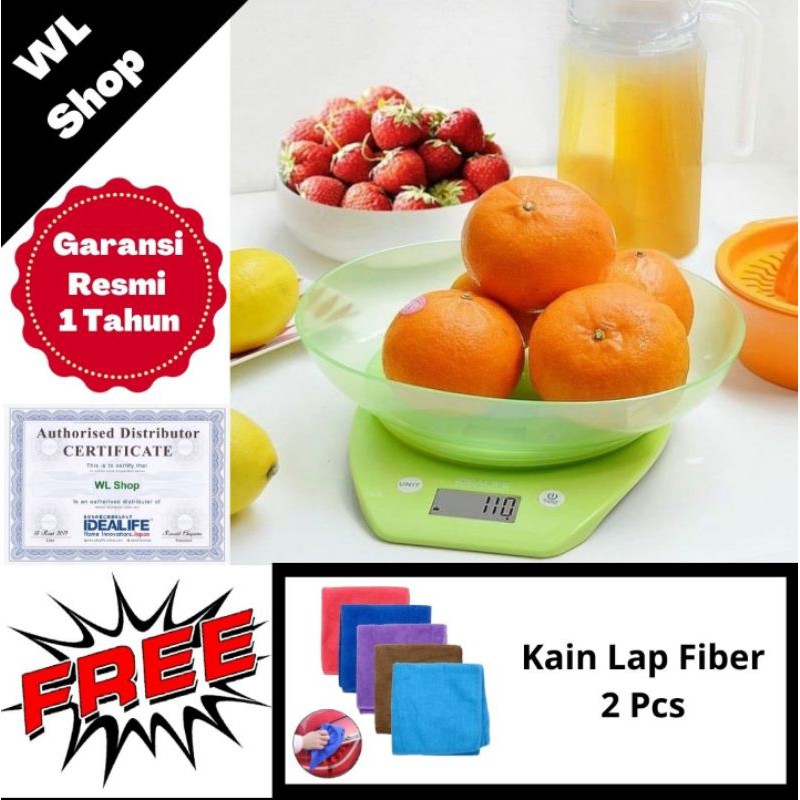 FREE 2pcs Kain Lap FiberSpesifikasi :- Kapasitas Maksimal : 5 Kg dengan akurasi 1 Gram- Pengukuran dalam gram, ml, oz, lbs- Tampilan digital- Fungsi Tare- Otomatis Mati/ manual Off- Otomatis nol- Indikator baterai rendah- Baterai: AAA x 2 Pcs (Sudah Termasuk)- Warma : Biru atau HijauIsi Produk :1x TImbangan Dapur Digital IL-2101x Wadah MangkukPanduan ManualKartu Garansi (isi form registrasi di website idealife)GARANSI RESMI IDEALIFE 1 TAHUN ( Baca Panduan Aktivasi Garansi )untuk menjaga barang aman pada saat pengiriman mohon untuk mengorder/pesan packing tambahan berupa plastik gelembung/bubble warp. kerusakan barang pada saat pengiriman jika tidak belanja bubble wrap bukan tanggung jawab kami. setiap barang sebelum dikirim akan di cek fisik dan fungsinya dahulu agar tidak merugikan buyer.#Timbangandapur #TimbangandigitalDapur #TimbanganKue #IL210 #TimbanganDapurBagus #TimbanganMurah #KitchenScaleDigital #TimbanganDigitalMakanan #WLSHOP #timbangandenganwadah #AlatDapurMurah #Timbangandigitalbagus #IdealifeDistributor #Idealifeonline #WLShop1 #timbangandenganmangkuk #idealifeshop #idealife #Timbangdapur #timbangukur #peralatan