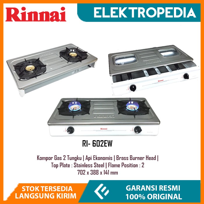 Rinnai Kompor Gas 2 Tungku White - RI602E-W / RI602EW PutihRinnai Kompor Gas 2 Tungku - RI602EW dirancang khusus dengan hasil api yang ekonomis sehingga dapat menghemat bahan bakar gas. Memasak di setiap hari kian leluasa tanpa was-was jika gas cepat habis. Adapun top plate yang terbuat dari bahan stainless steel menjadikan kompor bersifat anti karat serta mudah dibersihkan.Garansi 1 Tahun untuk Spare PartGaransi 3 Tahun untuk ServiceGaransi 5 Tahun untuk Katup GasRinnai Kompor Gas 2 Tungku RI602EW menjadikan memasak jadi lebih cepat dan efisien. Skala besar kecilnya api ekonomis bisa diatur sesuai tingkat kebutuhan. Dilengkapi dengan bagian top plate kompor dari Stainless Steel membuat pembersihan kian mudah.Api EkonomisBrass Burner HeadTop Plate : Stainless SteelFlame Position : 2Dimension (PxLxT) mm : 702 x 388 x 141 mmBerat :