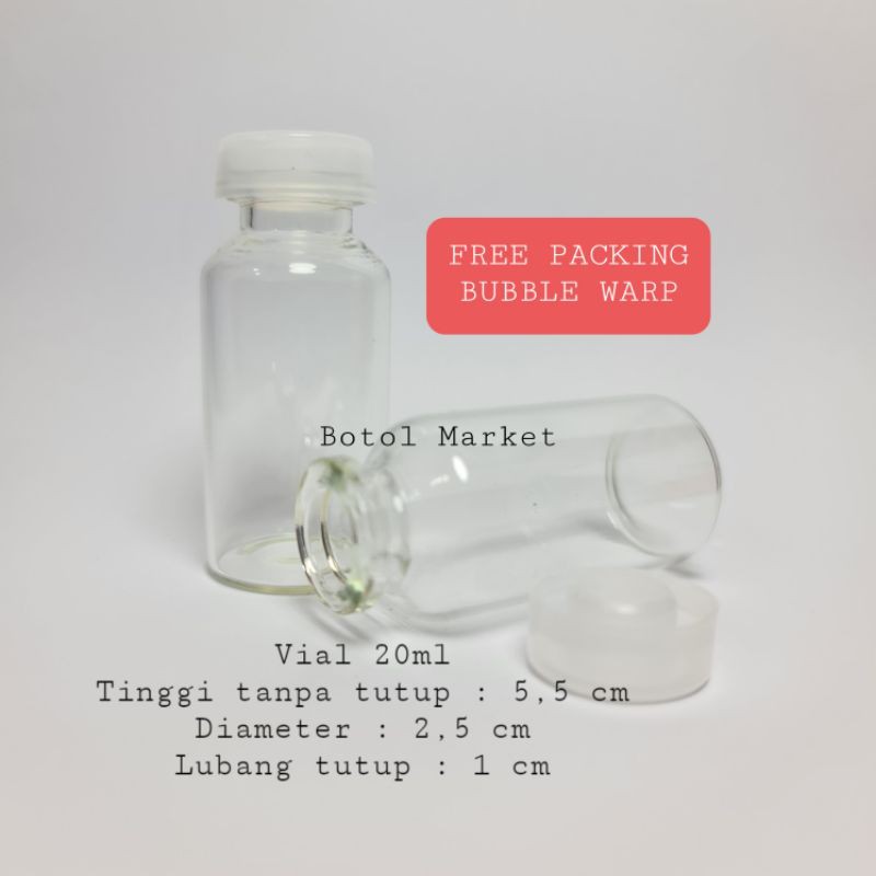 READY STOKPengiriman setiap hariorder sebelum jam 2 siang kita kirim hari yang sama( update resi malam )........................................SPESIFIKASI:Harga di atas untuk 1 botol dan tutup nyaBotol dari kaca dan tutup dari PLASTIK YANG KEDAP UDARA DAN TIDAK BOCORVial 20mlTinggi tanpa tutup : 5,5 cmDiameter : 2,5 cmLubang tutup : 1 cm1botol berat 20 gram1 kg muat 50 botol......................................KAMI SELALU PACKING DENGAN BUBBLE WRAPjika di rasa kurang aman bisa tambah bubblewrap,produk ada di jual di toko kami ( makin tebal bubblewrap maka makin aman paket anda )harap di perhatiakan sebelum membeli, produk kaca pasti adaresiko kerusakan ( pecah ) selama di pengirimankami hanya bisa berusaha packing seaman mungkin sesuai BUDGET tokoMOHON MAAF KAMI TIDAK MENGGANTI / MENGEMBALIKAN PRODUK YANG PECAHSELAMA PENGIRIMANTERIMA KASIH SUDAH BERKUNJUNG DAN BERBELANJA DI BOTOL MAREKTSEMOGA INFO YANG KAMI BERIKAN SUDAH JELAS DAN JIKA ADA PERTANYAAN,SILAHKAN CHAT KAMI.......#botolhias #botolsouvenir #botolterrarium #botolrustik #vasbungga #botolasikaca #botolbpafree #botolasikaca #grosirbotolasi #botolasimurah #botolsusubayi #botolkaca100ml #botolkacatutupkaret #botolasijakarta #botolmarket #botolvial100ml #botol5ml#botol8ml #botol10ml #botol12ml #botol15ml #botol20ml #botol25ml #botol30ml #botol35ml#botol50ml #botol