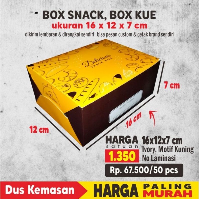 HARGA 50 PCSBox Snack, Dus Snack, Box Kue uk 16x12x7 cm Foodgrade cetak Full ColorBahan : Ivory 250 gr, Model Selip / kancingUkuran fisik : 15,8x11,8x6,8 cmCetak Full ColorHARGA 50
