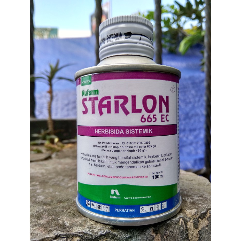 Nufarm Starlon Herbisida SistemikIsi : 100 mlBahan aktif : triklopir butoksi etil ester 665 g/l (setara dengan triklopir 480 g/l)Herbisida yang digunakan untuk membasmi kayu-kayuan seperti pohon sawit, karet, mangga ,jambu, bambu,rumput dan lainnya yang sudah tidak dimanfaatkan lagi / mengganggu. Anda dapat menggunakan herbisida ini untuk membunuh pohon tersebut secara perlahan karena bersifat sistemik dimana setelah diaplikasi kan maka pohon akan mati secara perlahan sampai dengan 1 bulan mati total (daun rontok dan batang pohon akan mengering dan layu)Petunjuk penggunaan :- larutkan 100 ml starlon dengan 1 liter air, kemudian siramkan pada pohon yang akan dibasmi- larutkan 100 ml starlon dengan 1 liter solar kemudian buat lubang pada pohon / gores pohon sampai bertemu lapisan hijaunya (xilem) oleskan perlahan dengan campuran starlon- bisa juga pohon disuntik dengan 10 ml larutan starlon pada kedalaman 10-15 cm dari diameter batang pohon( cara suntik dan oles lebih efisien dalam penggunaan starlon dibandingkan disiram pada pohon )Catatan:Pengiriman barang berbentuk cairan ke luar Pulau Jawa , jika tidak memungkinkan via JNE/wahana/TIKI/kilat khusus, akan dikirim via laut (paket pos dengan jangka waktu pengiriman oleh ekspedisi lebih lama)Terima kasih atas pengertiannya :)Order = S