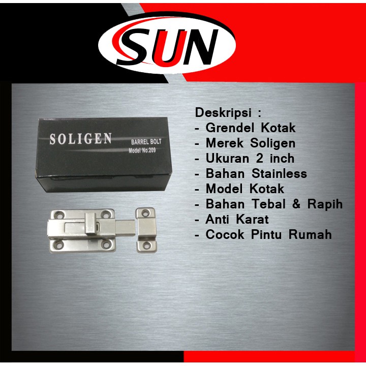 Deskripsi :- Slot / Grendel Pintu- Ukuran 2 " Inch- Bahan Plat stainless- Model kotak- Bahan tebal dan rapih- Isi 1 set Slot + Sekrup- Cocok Pintu kamar Mandi / kamar Tidur==========================================================Grendel Soligen memilki kualitas barang yang sangat baik dilihat dari material memilki plat yang lebih tebal dibandingkan dengan yang lain serta didukung finishing yang baik. soligen sendiri sudah memiliki nama didalam produk home hradware yang berkualitas dengan harga yang terjangkau.Salam,Sun Har