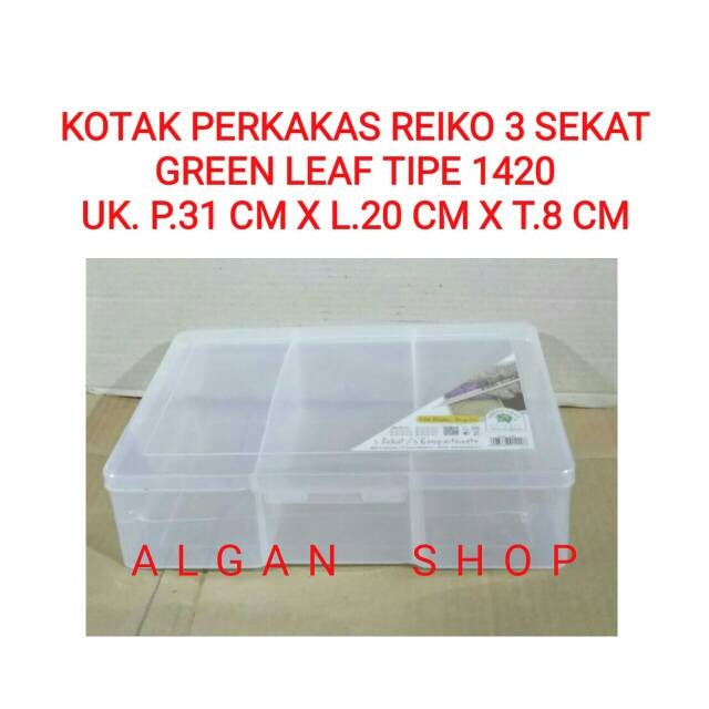 MOHON DISARANKAN BELI KOMBO TAMBAHAN PEMBUNGKUS BUBBLE WRAP AGAR BARANG LEBIH AMAN.Barang sebelum dikirim sudah melalui proses pemeriksaan dulu dan barang kondisi baru, baik, bagus dan tidak cacat.Kotak Perkakas Reiko.Merk = Green Leaf.Tipe = Reiko 1420.Ukuran Dimensi =P. 31 Cm x L. 20 Cm x T. 8 Cm.Ukuran Sekat =P. 10 Cm x L. 19 Cm.Spesifikasi Produk =- Terdiri dari 3 sekat.- Bahan plastik bening berkualitas food grade dan BPA Free.- Cocok untuk menyimpan makanan, aksesoris, spare part, baut, jarum jahit, benang, dll.- Mudah disimpan dan serbaguna.Nb.Mohon baca deskripsi produk dan konfirmasi stok sebelum membeli.Algan Shop.Thanks.Happy Shop
