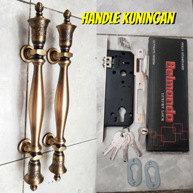 paket handle pintu kuningan asli 50cm 1set ( 2 gagang) + body pelor belmondo kunci komputer isi 4 anak kunci. bahan pegangan nya kuningan tebal dan k